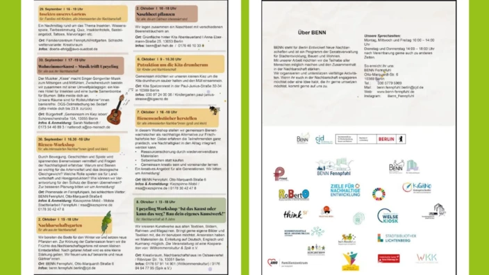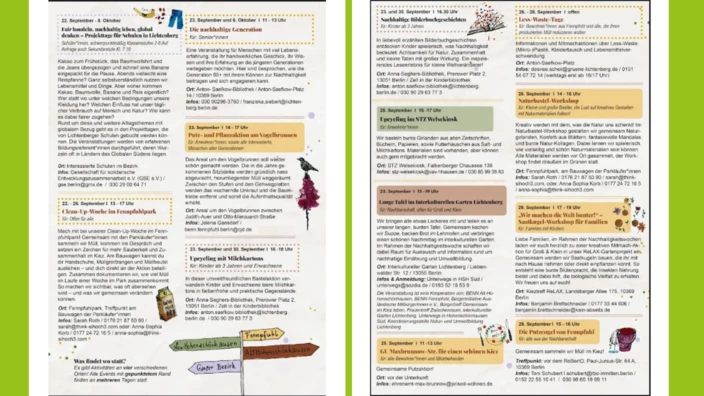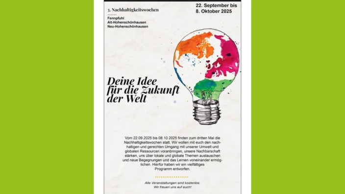 Mit den Nachhaltigkeitswochen soll ein Rahmen gesetzt werden, den nachhaltigen Umgang mit unserer Umwelt und der direkten Nachbarschaft zu stärken, neue Begegnungen und das Lernen voneinander zu ermöglichen. Hierfür haben verschiedene Akteur*innen und Projekte ein vielfältiges Programm entworfen. Wir freuen uns aufspannende Nachhaltigkeitswochen mit Euch!